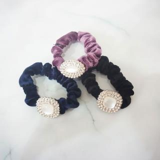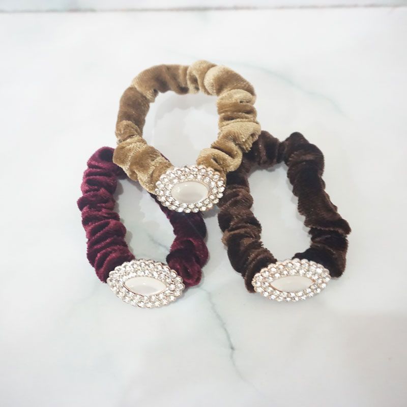 Ikat rambut bludru dengan desain yang unik dan terdapat hiasan mata mata di tengahnya membuat penampilan anda terlihat cantik