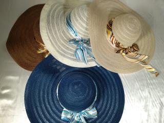 Topi nilon dengan desain yang lebar dan terdapat aksen pita pelangi di tengahnya membuat penampilan anda terlihat cantik