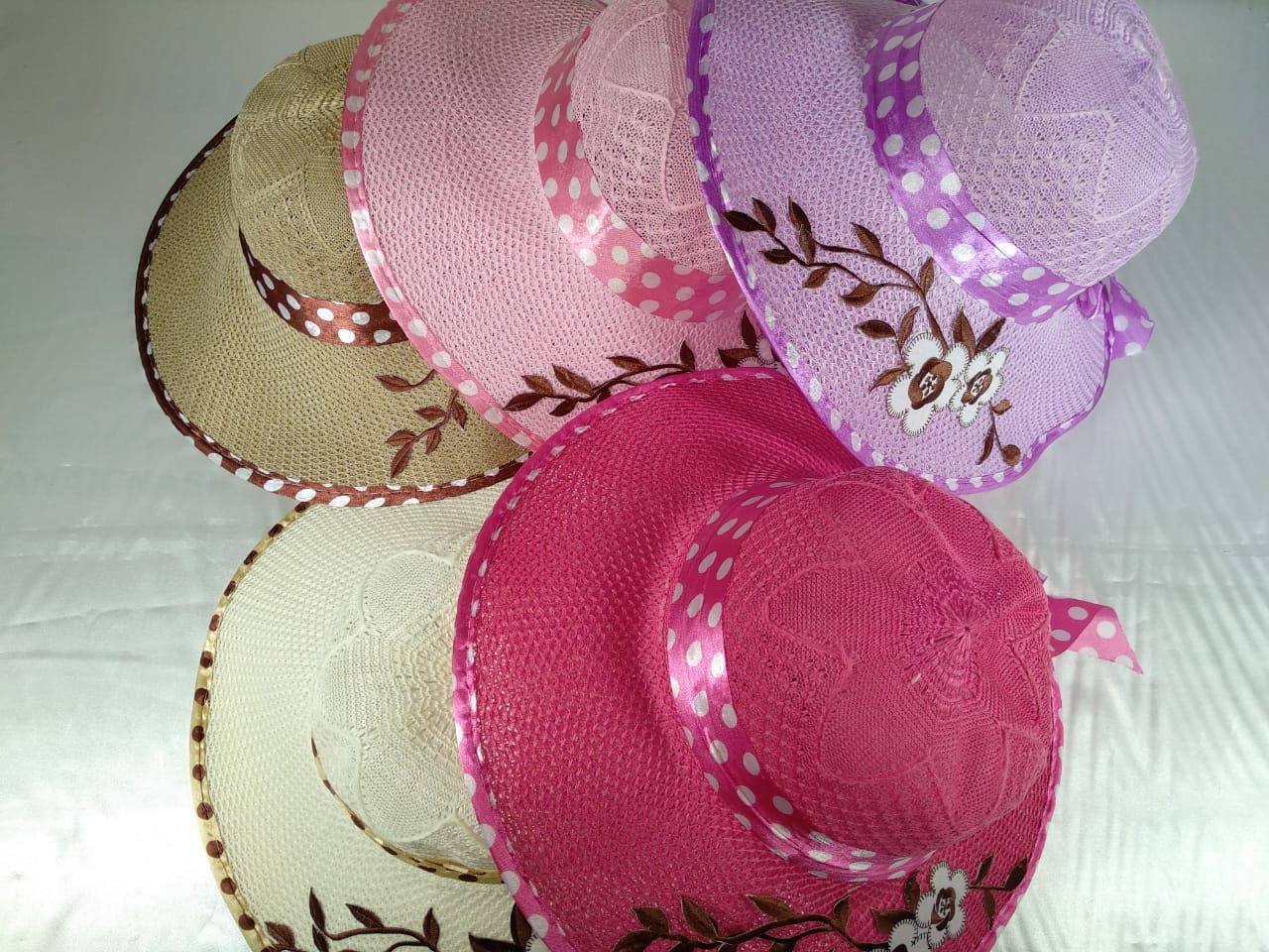 Topi Wanita dengan desain bunga tempel di atasnya dan terdapat sabuk pita di tengahnya
