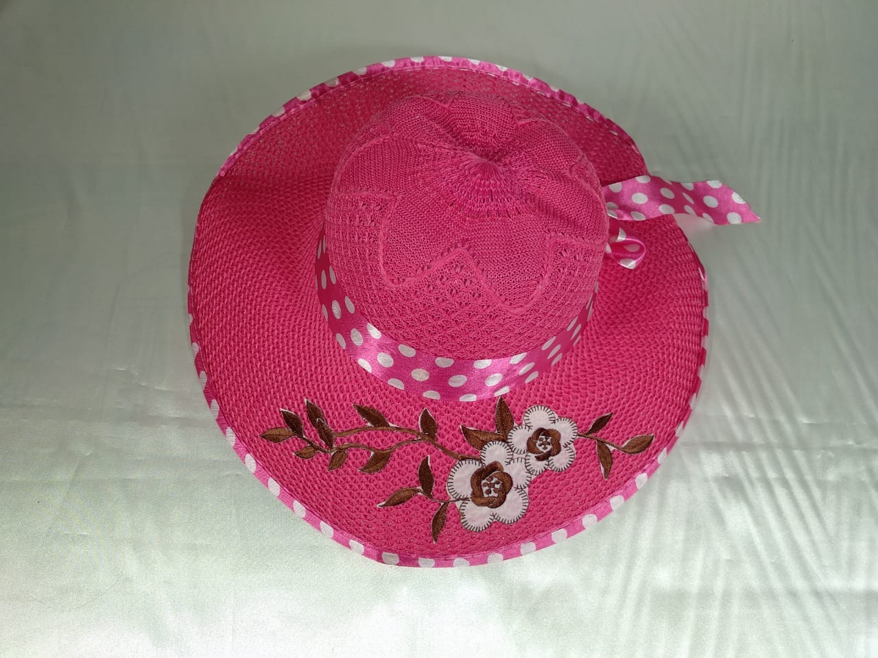 Topi wanita dengan desain bunga tempel di atasnya dan terdapat sabuk pita di tengahnya