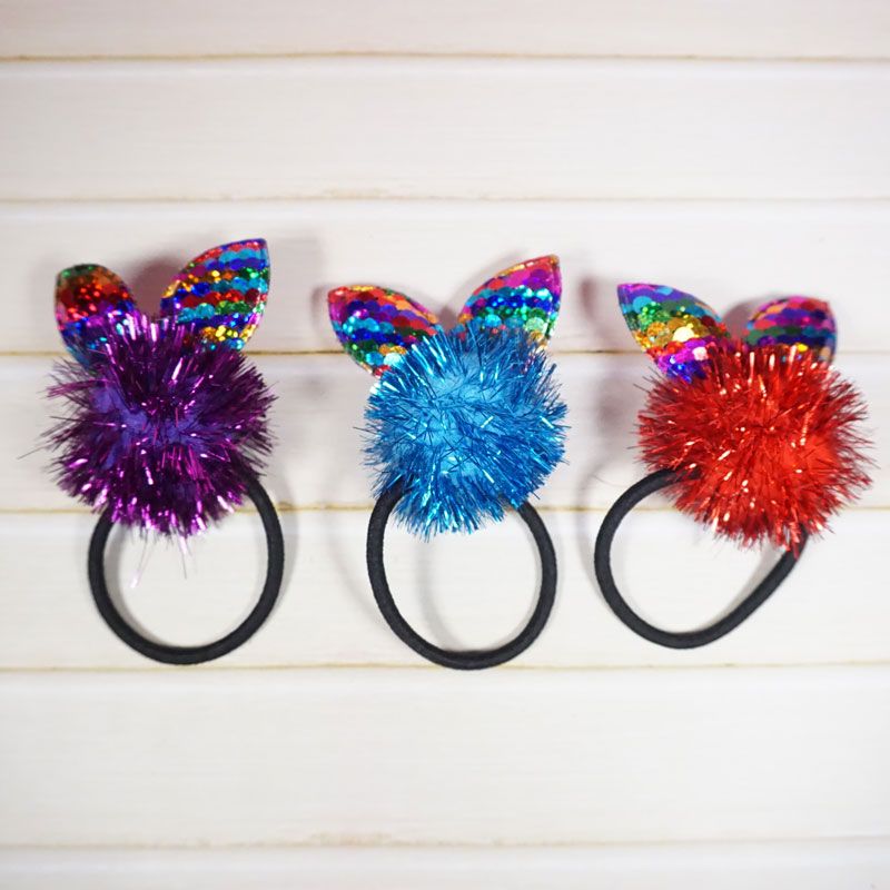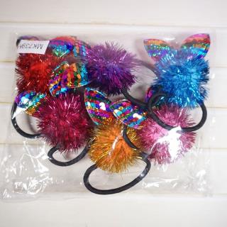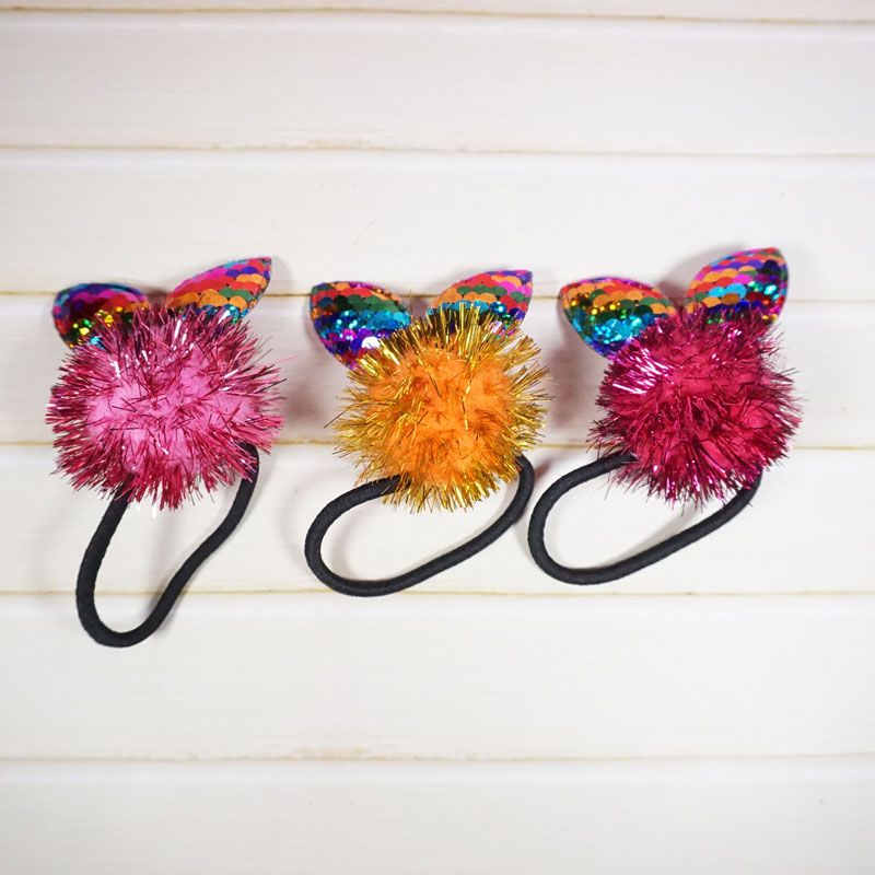 Ikat rambut dengan desain pom pom yang unik membuat penampilan anak anda terlihat cantik