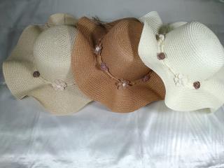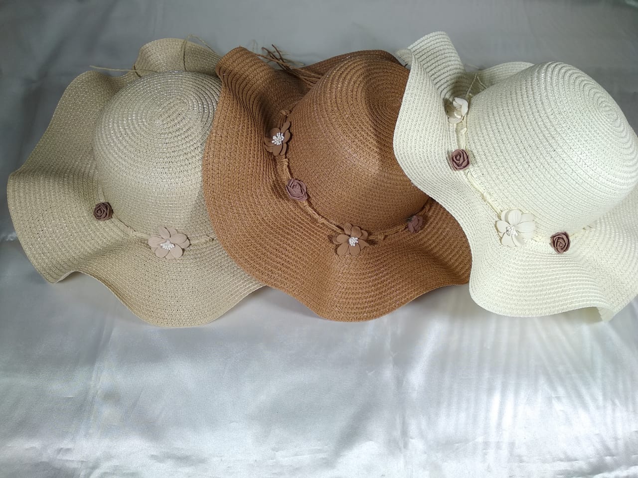 Topi wanita dengan desain pinggir gelombang dan terdapat hiasan sabuk bunga kecil di tengahnya