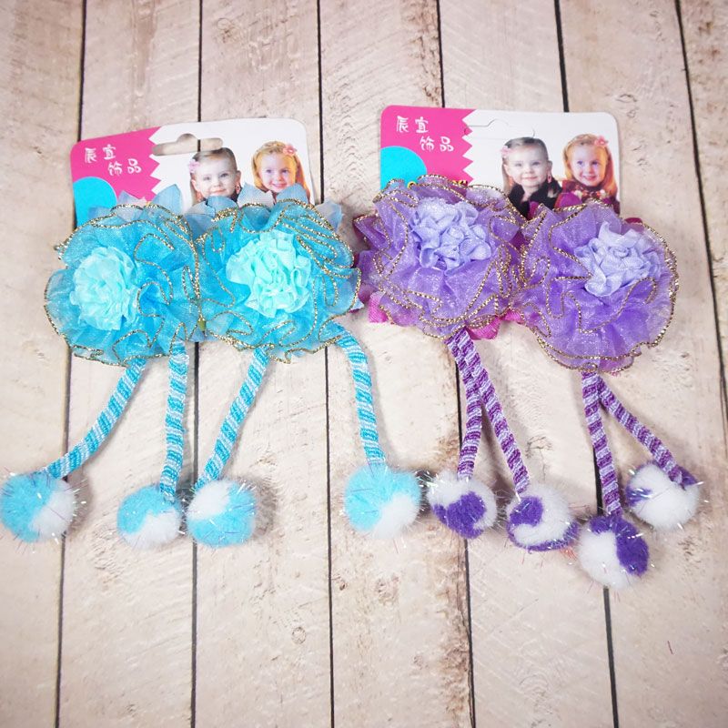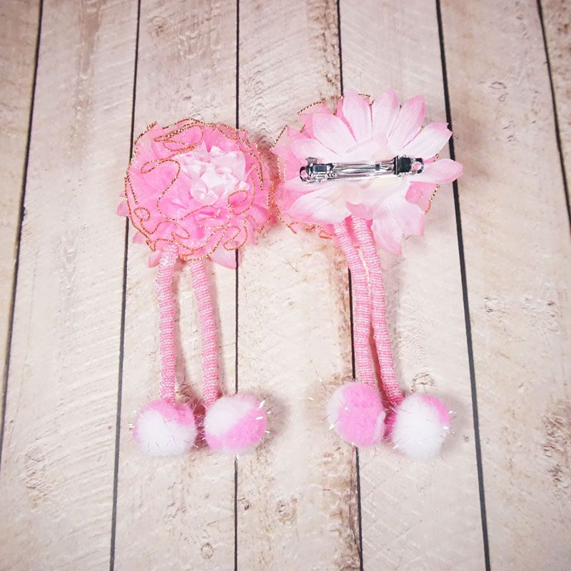 Pita jepit rambut dengan desain bunga dan terdapat pom pom membuat penampilan anak terlihat cantik