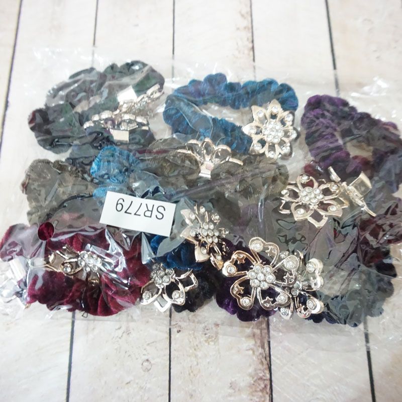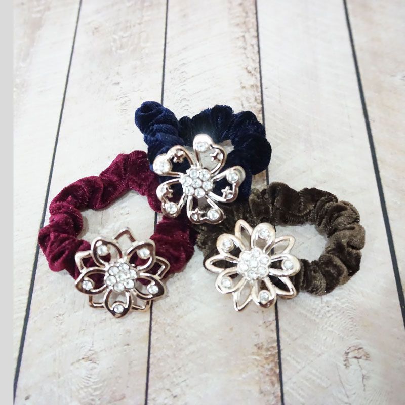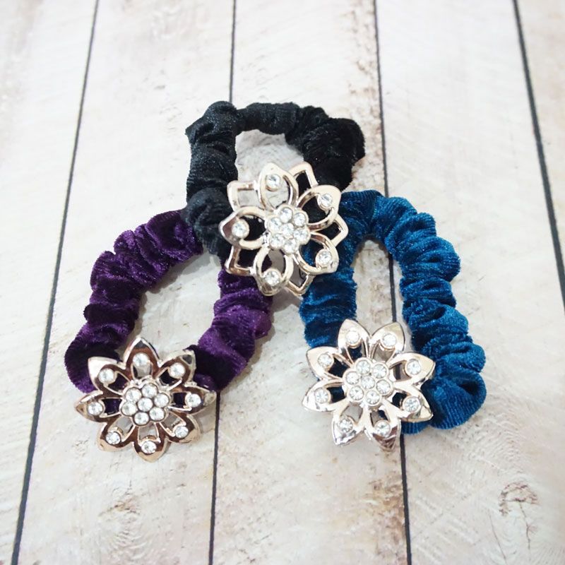 Ikat rambut dengan desain bludru yang lembut dan terdapat hiasan bunga ditengahnya