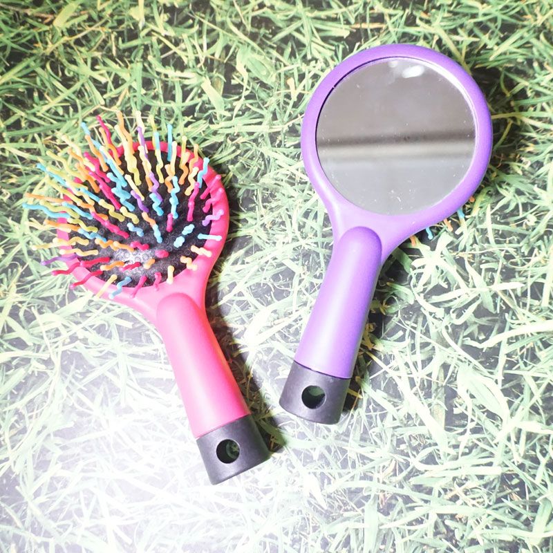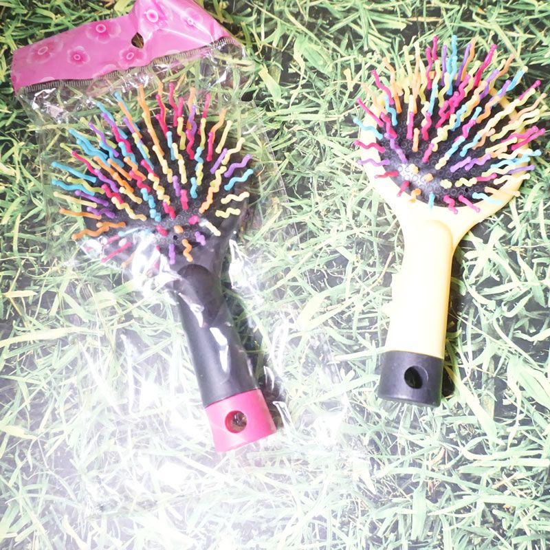 Sisir kaca dengan desain yang unik dan memiliki gigi yang berwarna warni berfungsi untuk merapikan tatanan rambut anda
