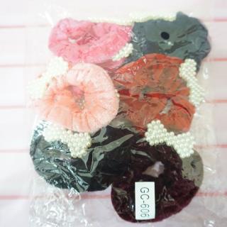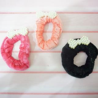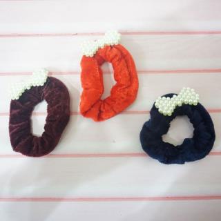 Ikat rambut bludru dengan desain yang unik dan terdapat hiasan mutiara di tengahnya membuat penampilan anda terlihat cantik
