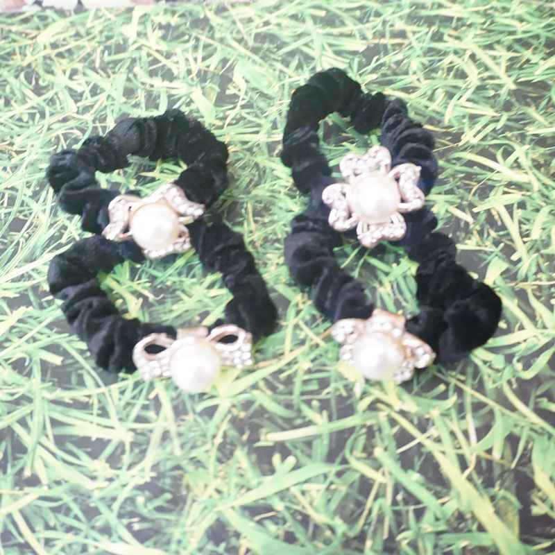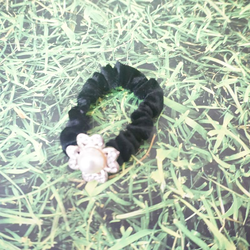 Ikat rambut bludru dengan bahan yang lembut dan terdapat hiasan mutiara di tengahnya