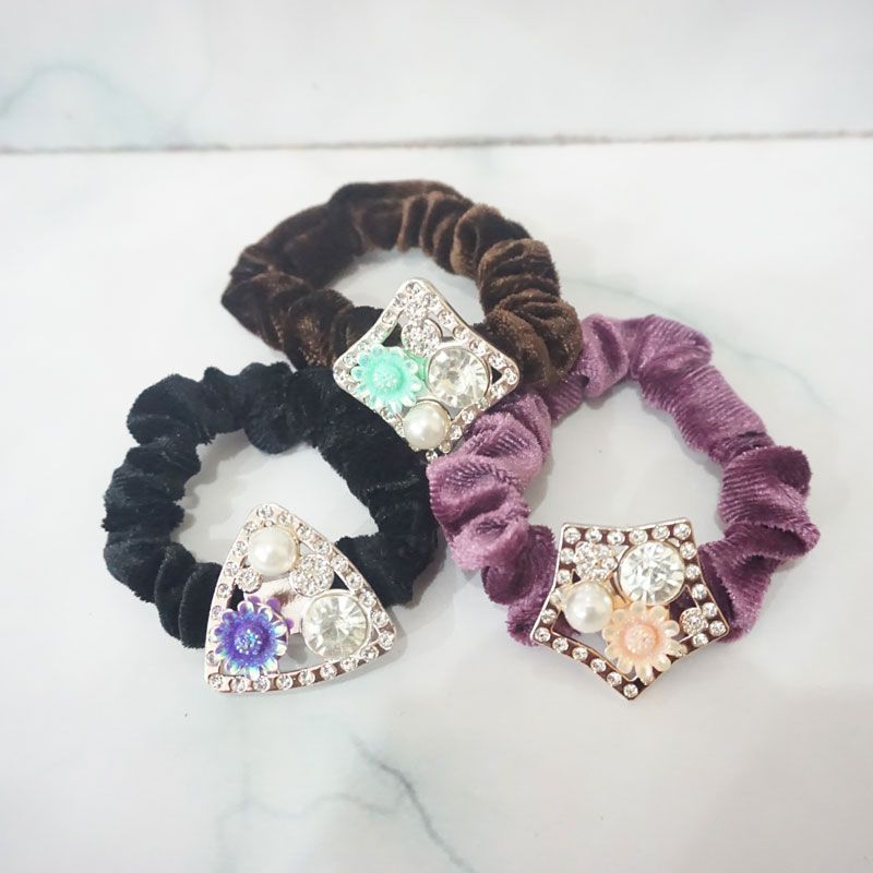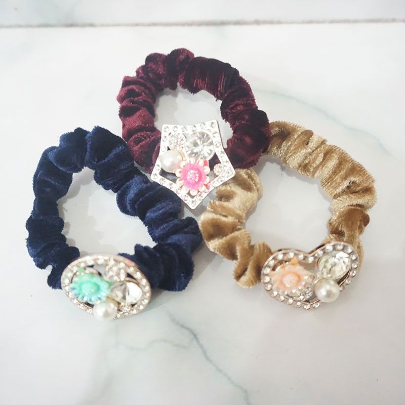 Ikat rambut dengan bludru yang lembut dan terdapat hiasan yang unik di tengahnya membuat penampilan anda terlihat cantik