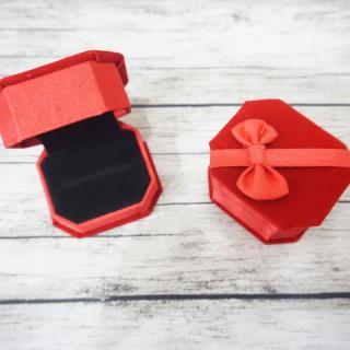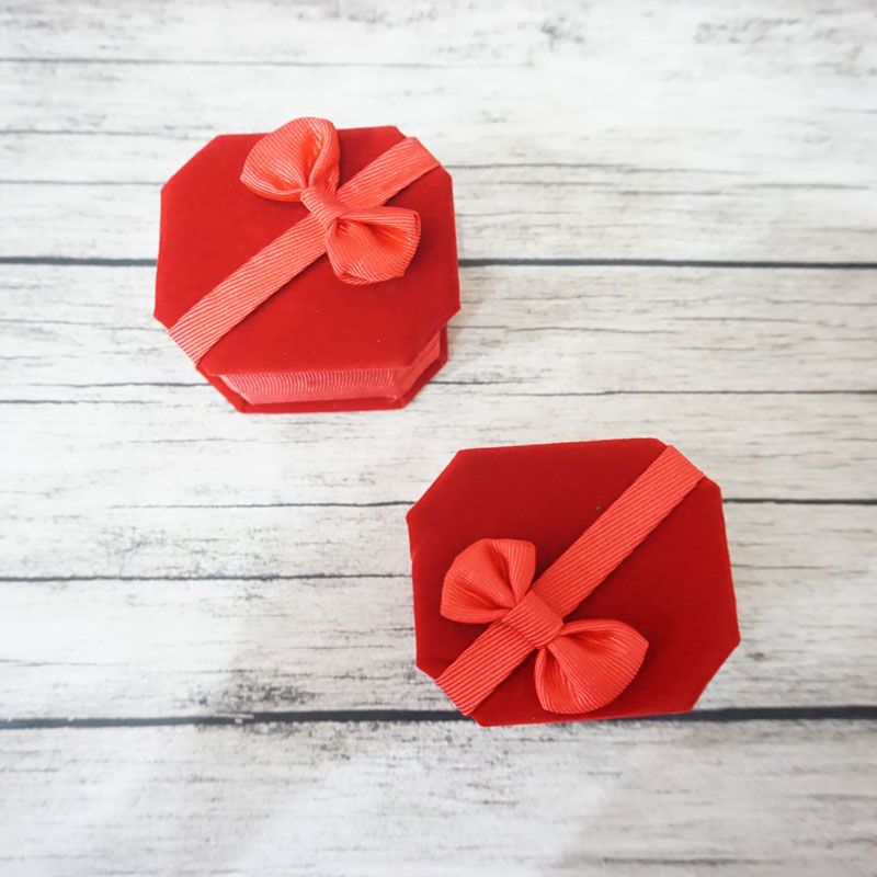 Tempat cincin dengan desain kotak bludru yang lembut serta terdapat hiasan pita di atasnya