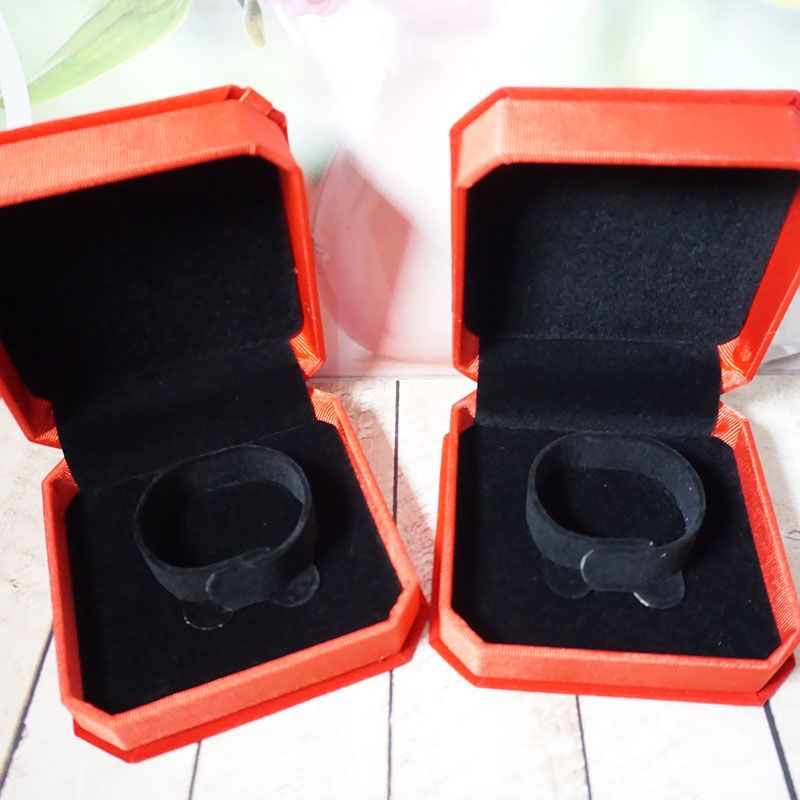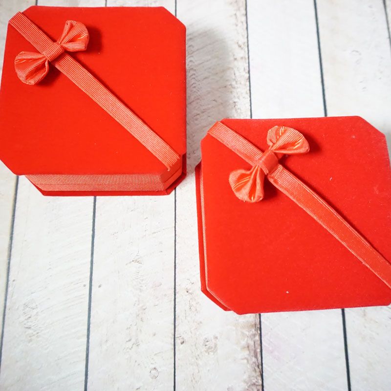 Tempat perhiasan dengan desain persegi bludru serta terdapat hiasan pita berwarna merah diatasnya