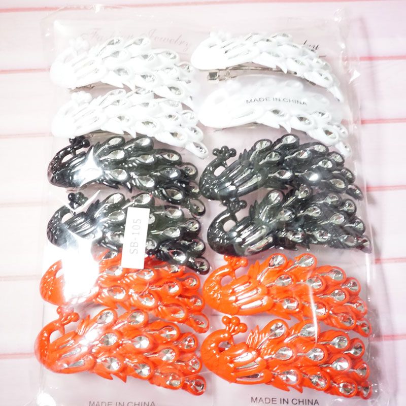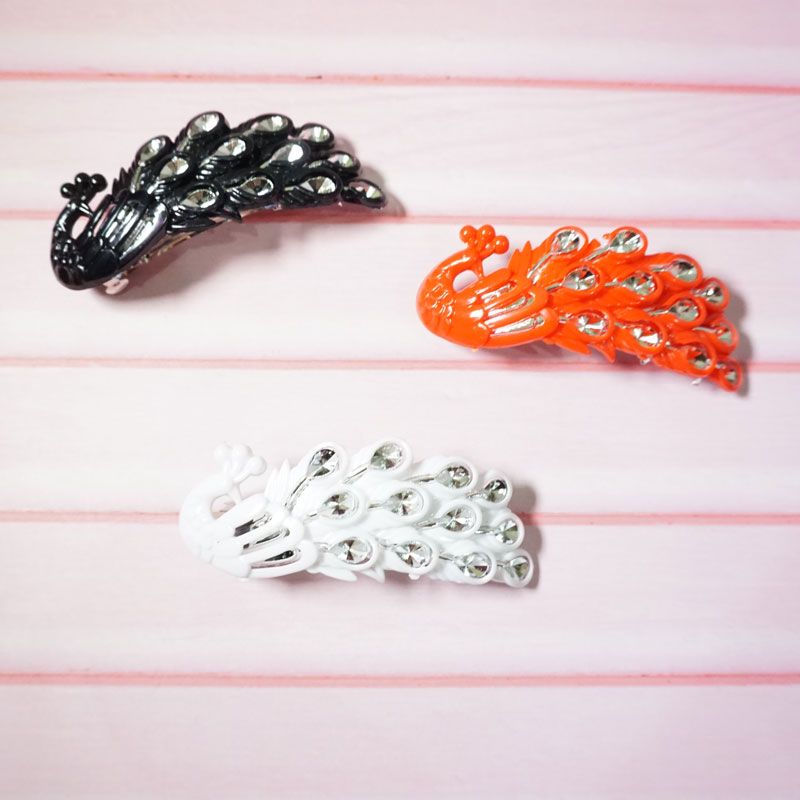 Jepit rambut dengan desain burung merak dan memiliki 3 macam warna