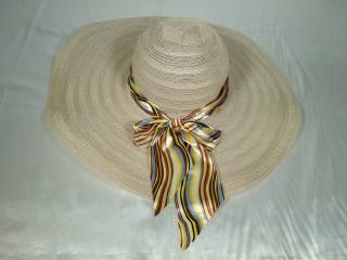 Topi nilon dengan desain lebar dan terdapat aksen sabuk pelangi di tengahnya membuat penampilan anda terlihat cantik