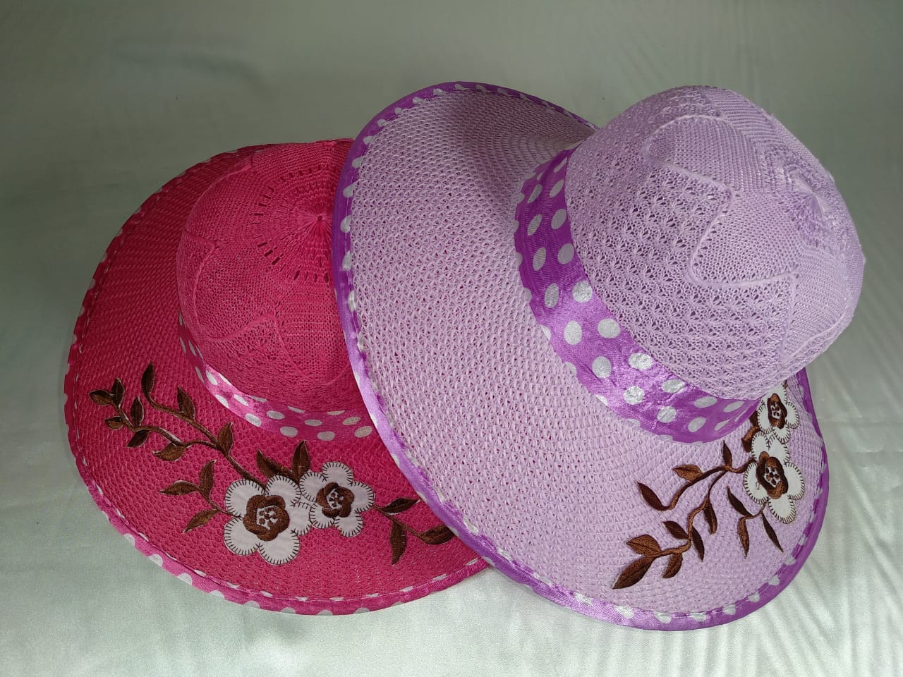 Topi wanita dengan desain bunga tempel dan terdapat aksen sabuk pita di tengahnya