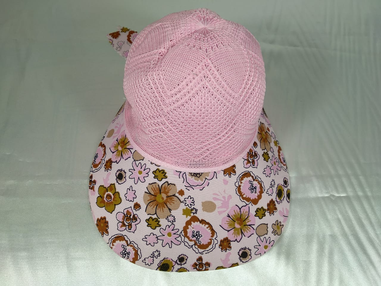 Topi wanita dengan desain setengah rajut dan terdapat motif bunga di atasnya