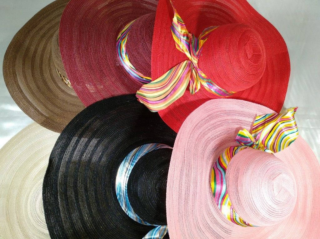 Topi wanita dengan desain yang lebar dan terdapat sabuk pita pelangi di tengahnya