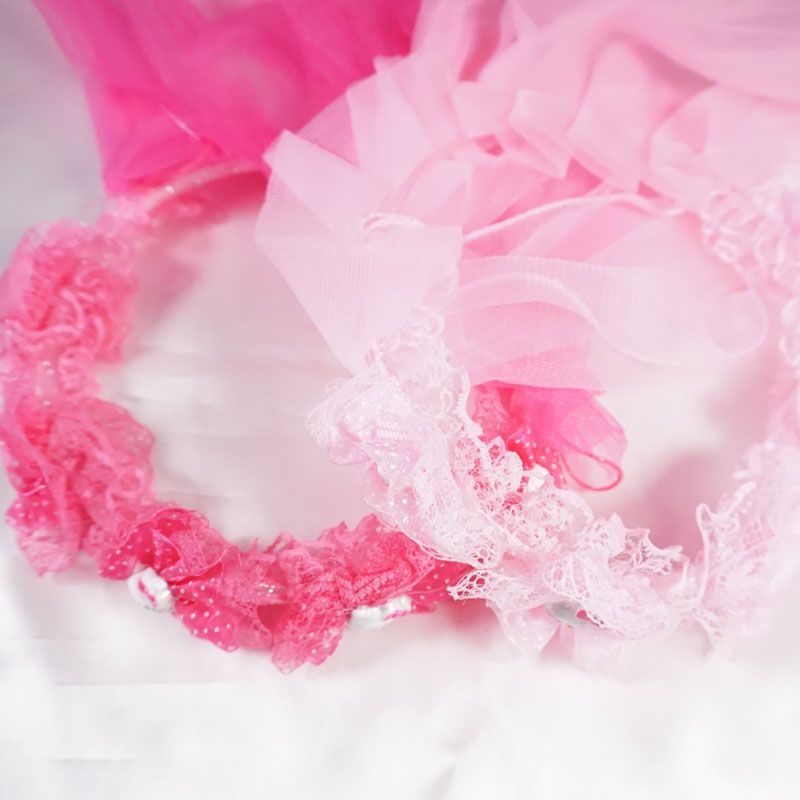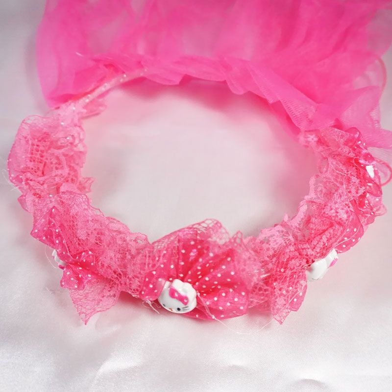 Bando dengan desain rumbai bunga dan terdapat hiasan boneka di tengahnys serta terdapat rumbai panjang yang menjuntai ke bawah