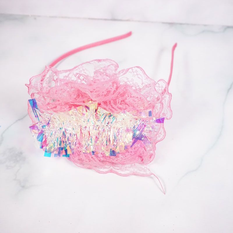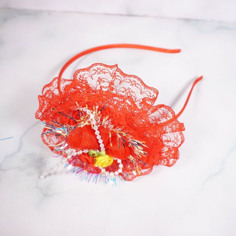 Bando dengan desain yang unik dan terdapat hiasan rumbai bunga diatasnya membuat penampilan anak terlihat cantik