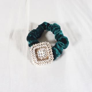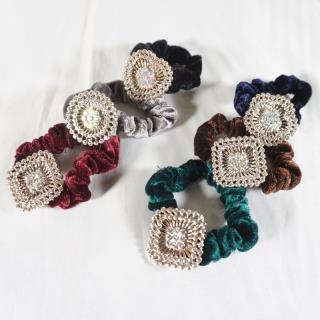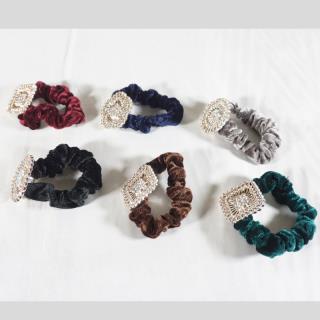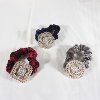 Ikat rambut bludru dengan desain yang unik dan terdapat hiasan mata mata di tengahnya membuat penampilan anda terlihat cantik