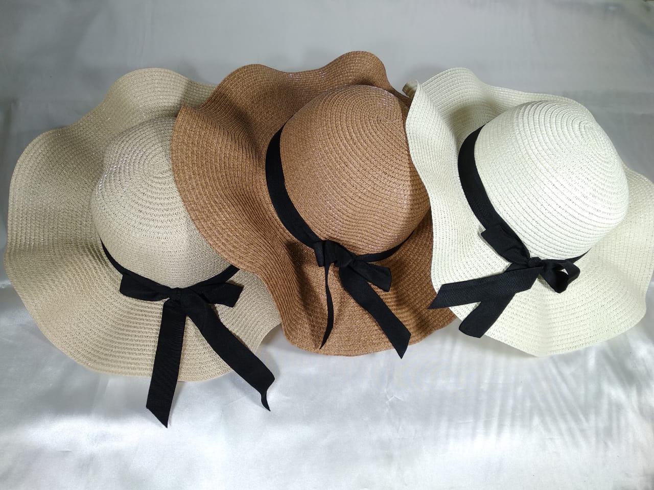 Topi wanita dengan pinggir gelombang dan terdapat sabuk pita hitam di tengahnya
