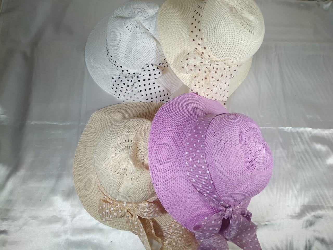 Topi wanita dengan desain yang cantik dan terdapat hiasan sabuk pita di tengahya