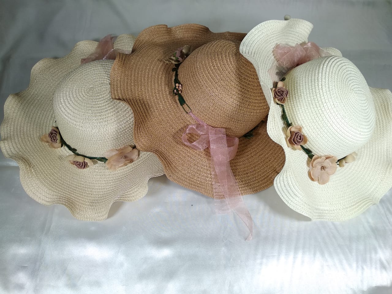 Topi wanita dengan desain pinggir gelombang dan terdapat hiasan sabuk bunga di tengahnya
