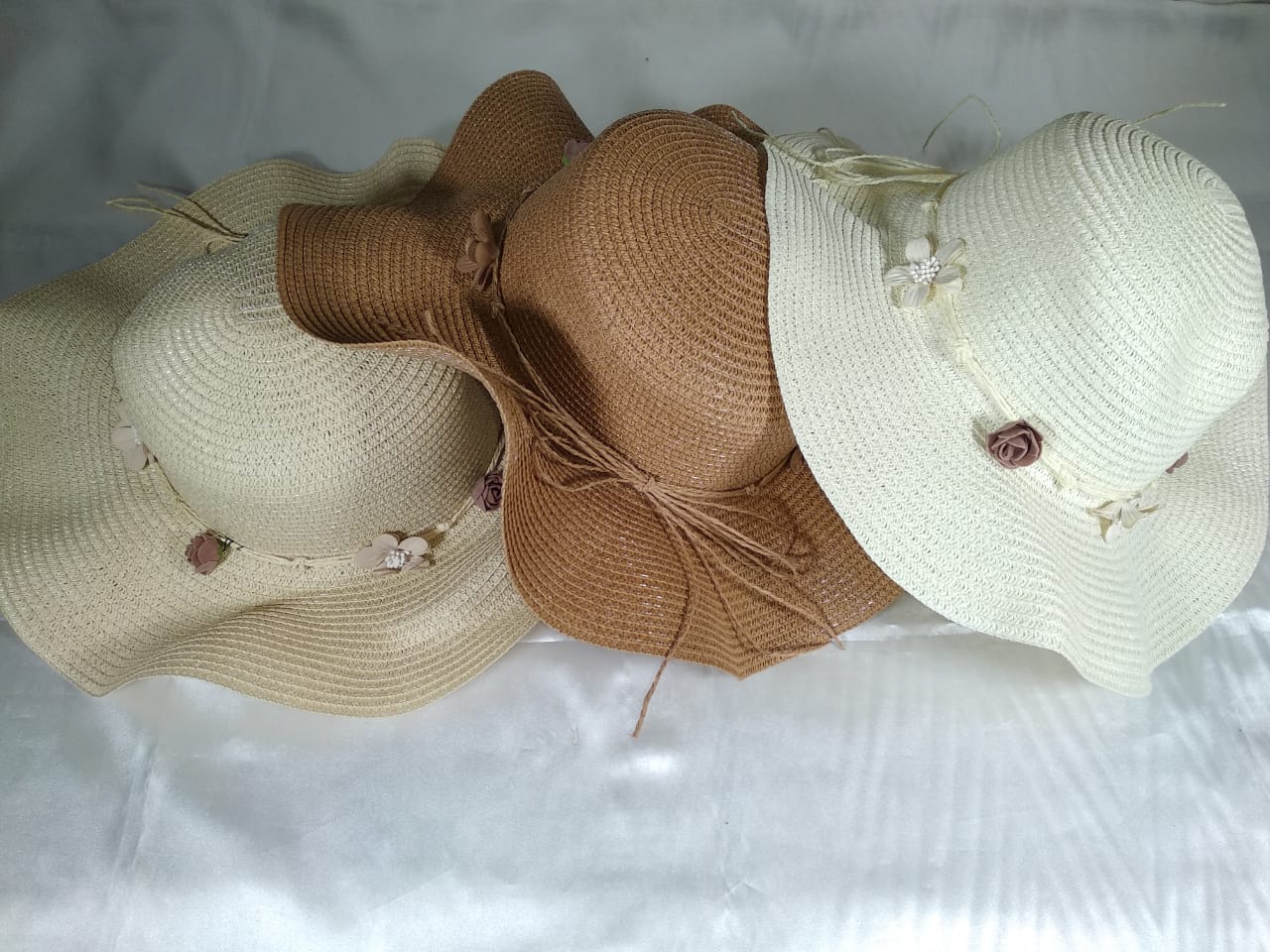 Topi wanita dengan desain pinggir gelombang dan terdapat hiasan sabuk tali bunga di tengahnya