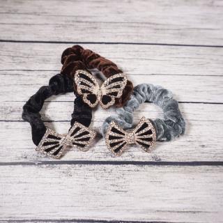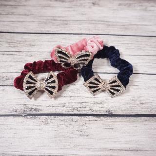 Ikat rambut dengan desain bludru yang halus serta memiliki hiasan yang beragam di tengahnya