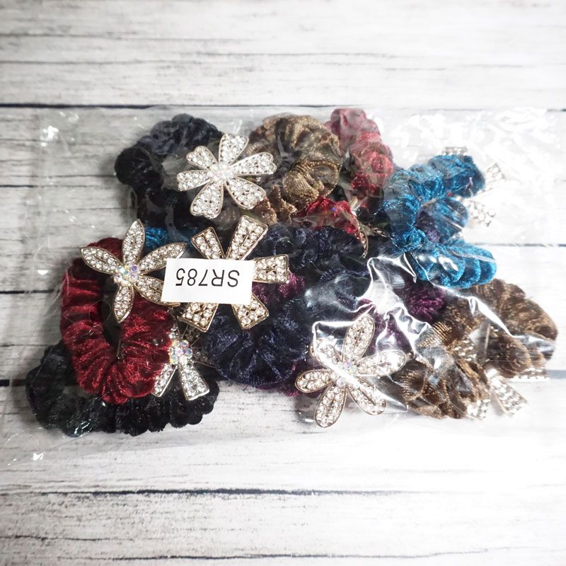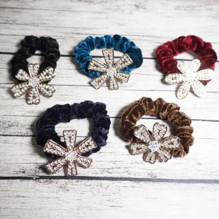 Ikat rambut dengan desain bludru dan memiliki hiasan bunga di tengahnya