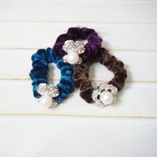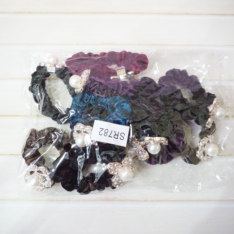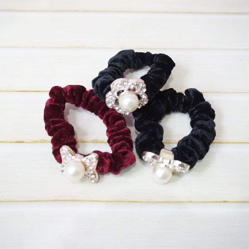 Ikat rambut dengan desain bludru yang lembut dan terdpat hiasan mutiara di tengahnya