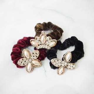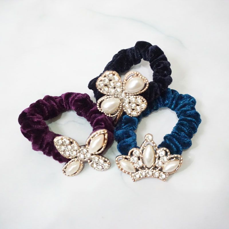 Ikat rambut dengan desain bludru yang halus dan terdapat hiasan yang unik ditengahnya