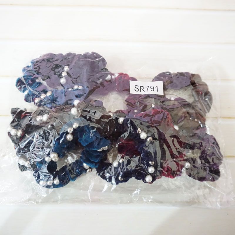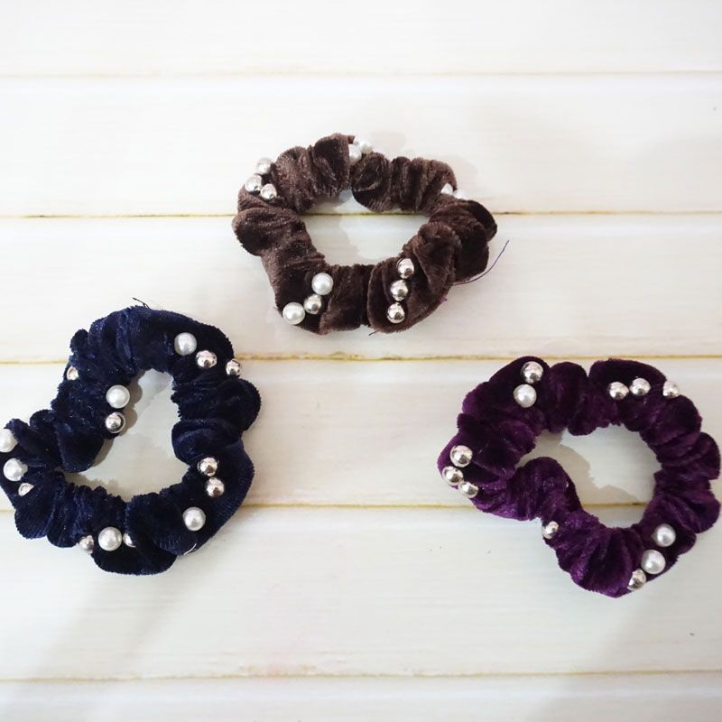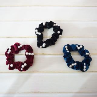 Ikat rambut dengan desain bludru yang lembut dan dihiasi mutiara diatasnya