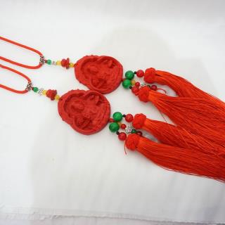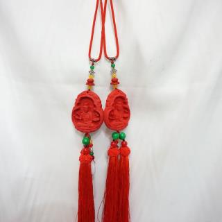Hiasan tali merah dengan aksen batu ukir di tengahnya dapat digunakan sebagai hiasan rumah dan mobil