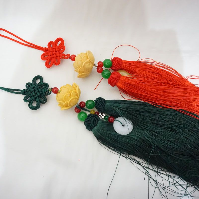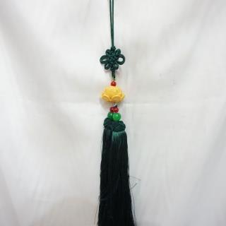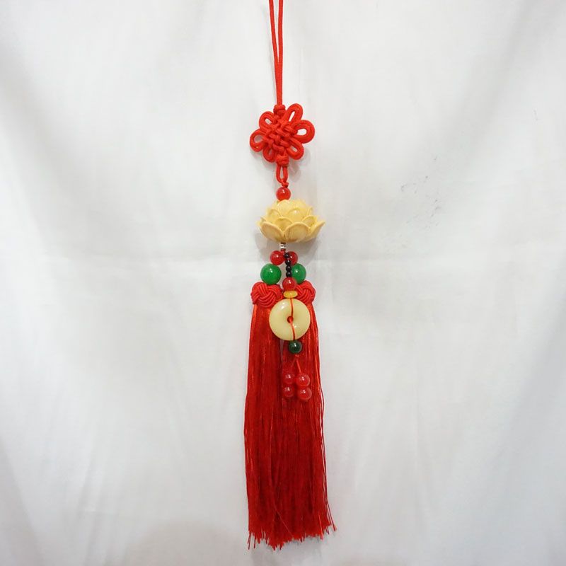 Hiasan tali merah dengan hiasan bunga di tengahnya serta terdapat rumbai di tengahnya
