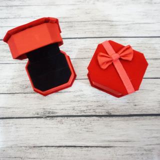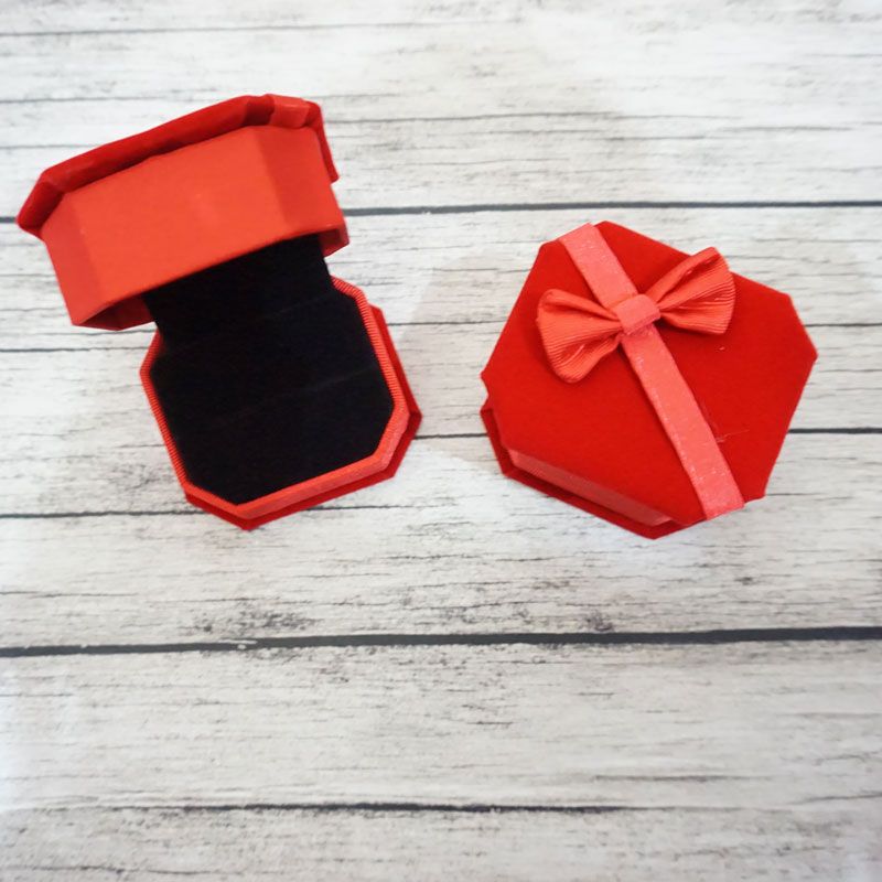Tempat cincin bludru  dengan desain kotak dan terdapat hiasan pita diatasnya
