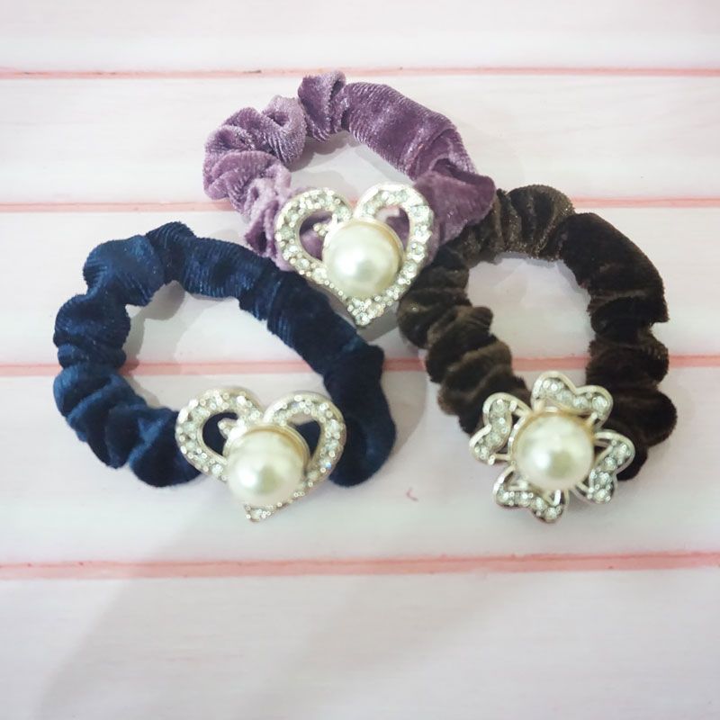 Ikat rambut dengan bahan yang lembut dengan berbagai model unik di tengahnya dan terdapat hiasan mutiara di tengahnya membuat penampilan anak terlihat cantik