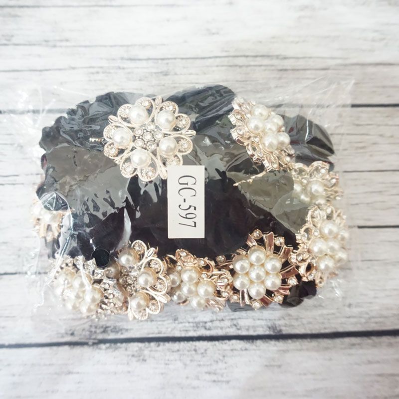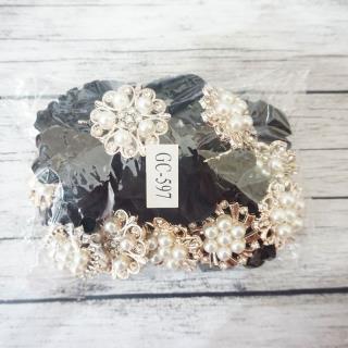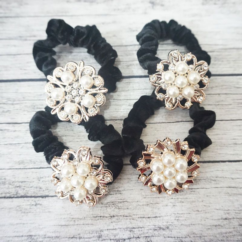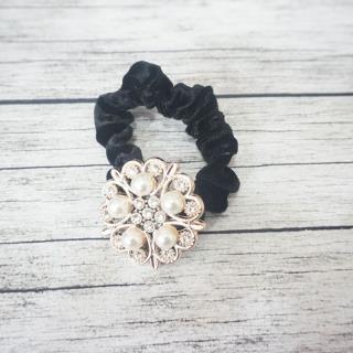 Ikat rambut dengan bahan bludru dan terdapat hiasan bunga di tengahnya dan terdapat hiasan mutiara membuat penampilan anda terlihat cantik