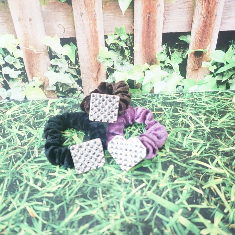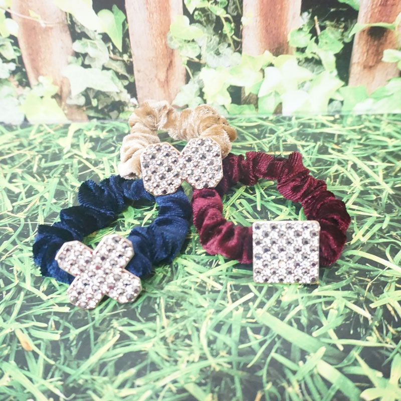 Ikat rambut bludru dengan desain yang unik dan terdapat hiasan mata mata membuat penampilan anda terlihat cantik