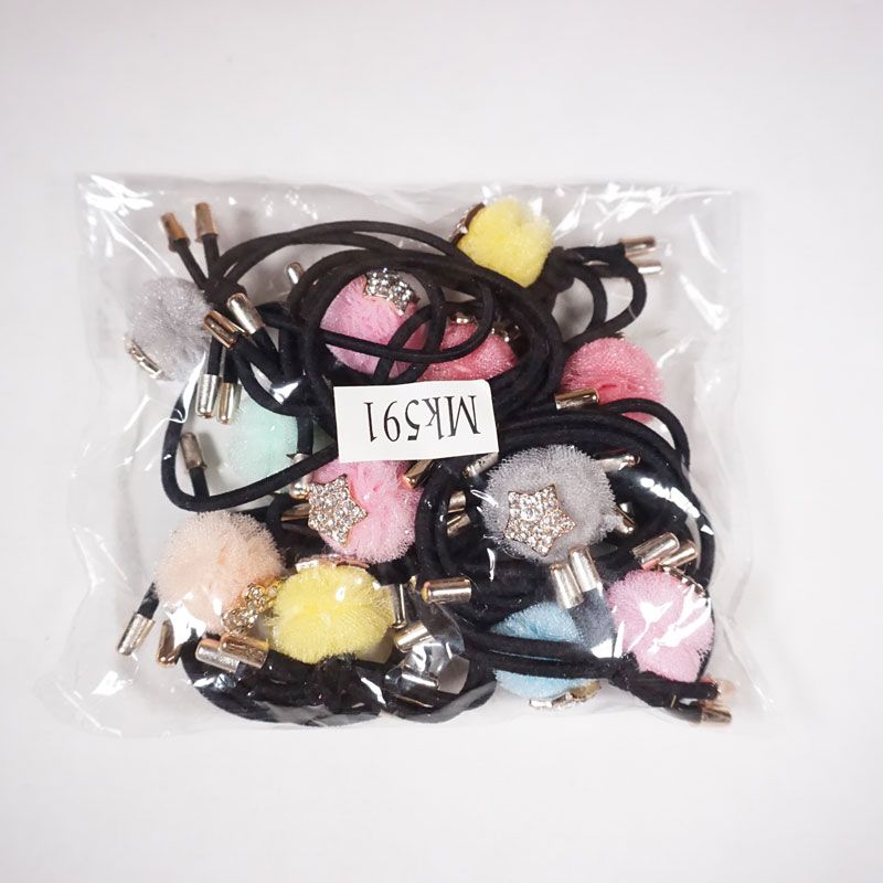 Ikat rambut dengan desain yang unik dan terdapat pom pom dengan terdapat tempelan hiasan bintang dan love dapat mempercantik penampilan anda