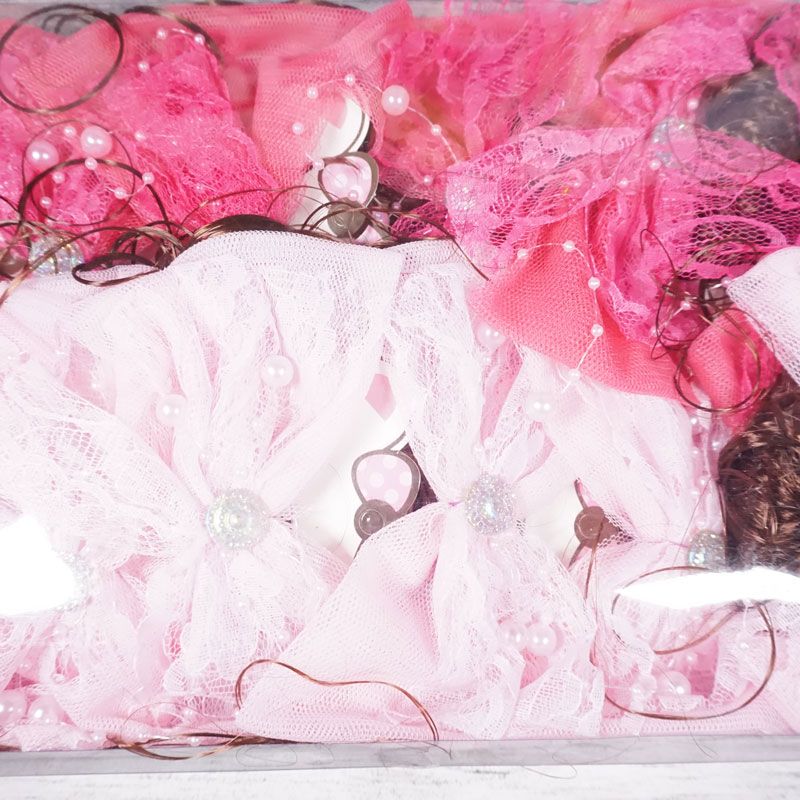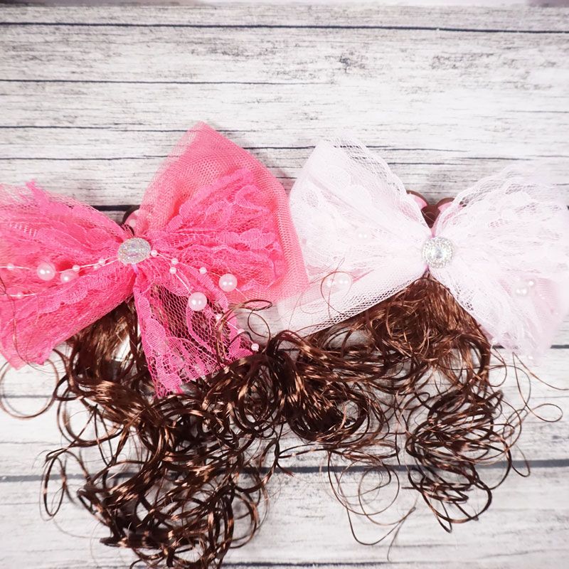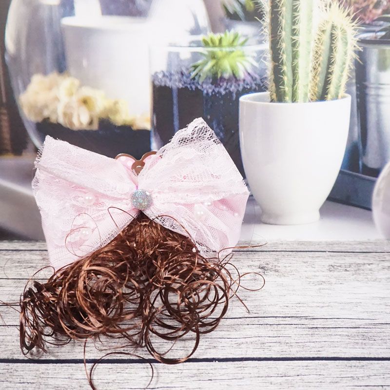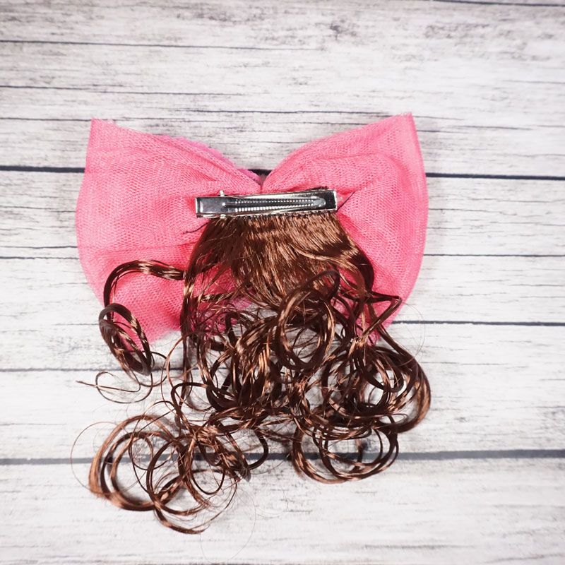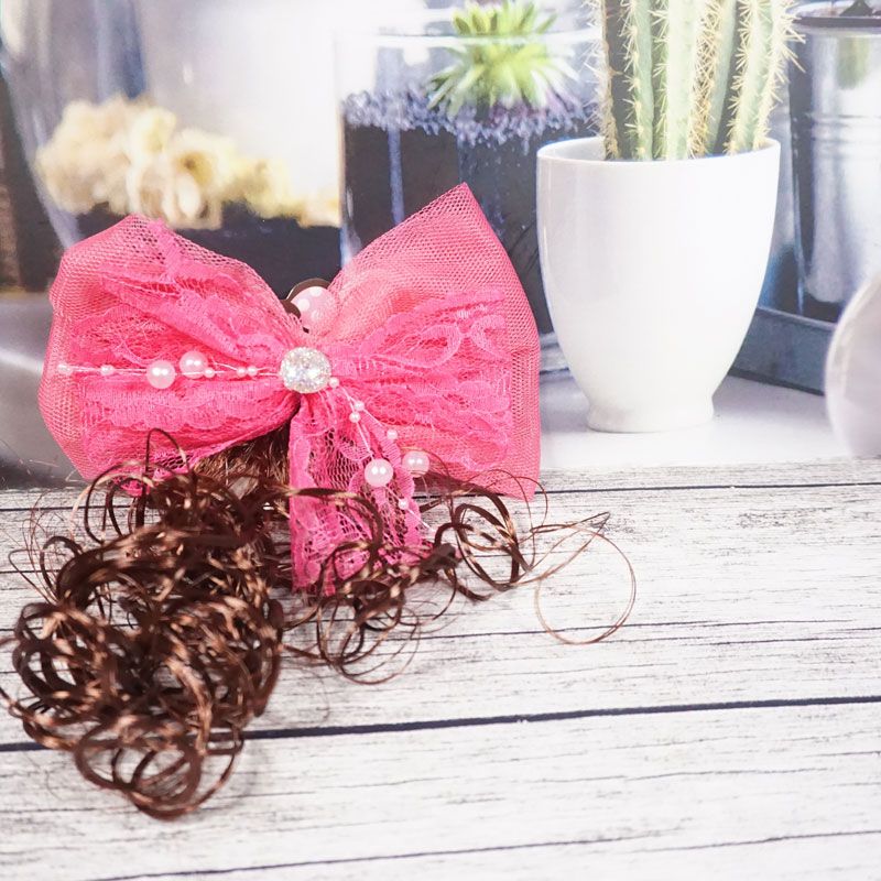 Jepit rambut dengan desain pita dan ditengahnya terdapat aksen mutiara serta terdapat hiasan rambut curly berwarna coklat membuat penampilan anak terlihat cantik