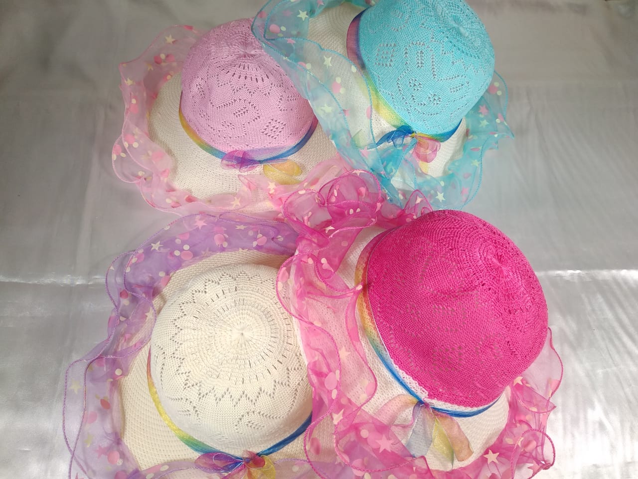 Topi anak dengan desain renda pelangi di pinggirnya  membuat penampilan anak terlihat cantik